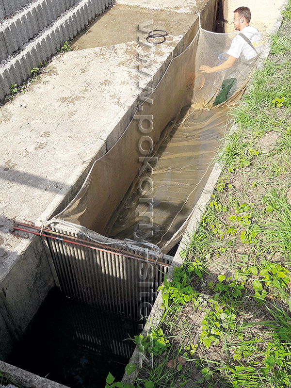 Wie wird dieses Produkt verwendet? - Der Netzkäfig unter den Damm wird mithilfe des Ablassärmels mit einem Klemmgurt/Zurrgurt zum Ablaufrohr befestigt, durch das der Weiher/Teich abgelassen wird. Unterhalb des Weihers ist der Käfig am Rand des Beckens / der Grube befestigt, das/die durch einen Rahmen aus Bohlen, Bälkchen gemacht wird, oder zum Rand des/der ausbetonierten Beckens/Grube, und zwar so, dass es/sie Form und Mass hält. Durch das Ablaufrohr und den Netzärmel laufen die Fische frei in den vorbereiteten Käfig ein, aus dem sie bequem entweder manuell mit dem Kescher, bzw. mit dem mechanischen Kescher / Hebekescher zur weiteren Sortierung und Transport entnommen werden.